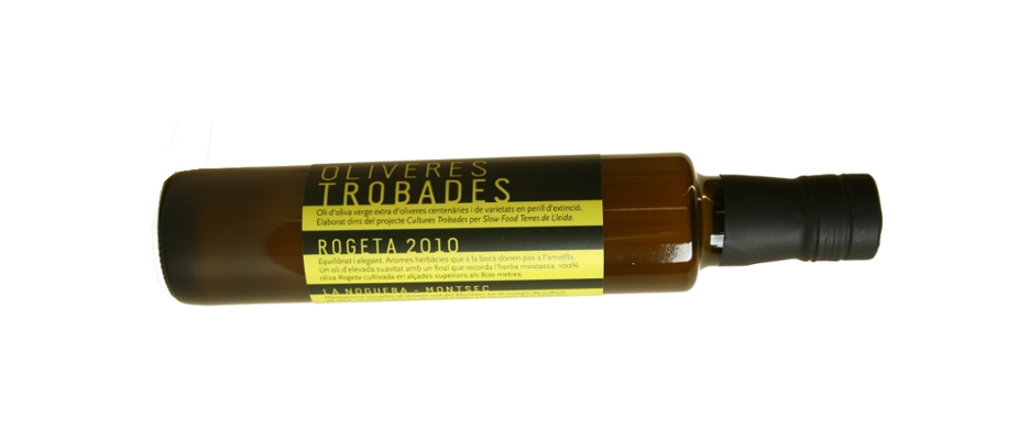 Aceite de oliva virxe extra de oliveiras centenarias e variedades en perigo de extinción. Producido dentro do proxecto CULTURES TROBADES de Slow Food Terres de Lleida.